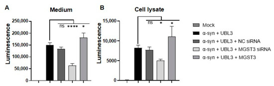 In our previous study, we found that silencing of MGST3 significantly reduced the interaction between α-syn and UBL3 using split Gaussia complementary luciferase analysis [19]. To further explore the effect of MGST3 on the interaction between α-syn and UBL3, we both silenced and overexpressed MGST3 in the HEK293 cells. Split Gaussia complementary luciferase assay of cell culture and cell lysates collected 72 h after transfection showed that the luminescence intensity in the cell culture medium (Figure 1A) and cell lysate (Figure 1B) was significantly reduced after silencing MGST3, which was consistent with our previous results. The luminescence intensity in the cell culture medium and the lysate was significantly enhanced after overexpression of MGST3. These results show that MGST3 can affect α-syn and UBL3 interactions in HEK293 cells.