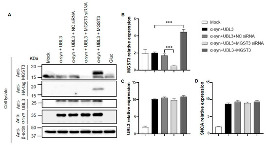 Effect of MGST3 in α-syn and UBL3. (A) Effect of MGST3 in α-syn and UBL3 at the protein level. The siRNA, NGluc-UBL3, α-syn-CGluc, and MGST3-HA were co-transfected into HEK293 cells, and cell lysate was blotted with various antibodies. (B–D) Effect of MGST3 on α-syn and UBL3 gene expression. The siRNA, UBL3, α-syn, and MGST3 were co-transfected into HEK293 cells, and the expression of MGST3, UBL3, and α-syn in the cells. The gene expression of MGST3, UBL3, and SNCA were analyzed for 48 h after transfection by RT-qPCR, respectively. Unpaired t-test (n = 3 per group); all data represented as mean ± SD. ***: p-value < 0.005; NC siRNA: negative-control siRNA.