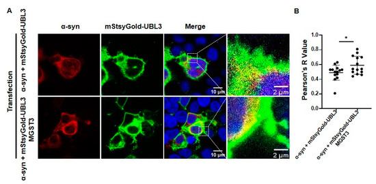 These results indicate that overexpression of MGST3 could increase the localization of α-syn and UBL3. First, we constructed UBL3 tagged with mStayGold, which is a bright and highly photostable fluorescent protein. Then, co-transfection with α-syn, mStayGold-UBL3, and MGST3 was conducted in HEK293 cells for immunocytochemical staining. The results indicated that the co-localization of α-syn and UBL3 was enhanced after overexpression of MGST3 (Figure 3A,B).