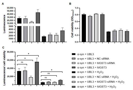 MGST3 has a glutathione-dependent peroxidase activity of lipid hydroperoxides [26,27], and we previously reported that 800 µM of H2O2 mimicked oxidative stress and downregulated the interaction between α-syn and UBL3 [19]. To verify whether the effect of MGST3 overexpression on the interaction between α-syn and UBL3 is altered under the excess oxidative stress, we treated HEK293 cells co-transfected with siRNA, α-syn-CGluc, NGluc-UBL3, and MGST3 with 800 µM H2O2. Cell culture media from different experimental groups were collected for luminescence assay, and we assessed the cell activity using MTT. The luminescence intensity was significantly reduced in the cell culture medium under excess oxidative stress (Figure 4A). On the other hand, the luminescence intensity increased in the overexpression of MGST3, whether with or without oxidative stress treatment. Moreover, we observed that oxidative stress significantly reduced cell viability (Figure 4B), but there was no significant difference in cell activity between the groups under the same transfection conditions. To exclude that there were differences in cell viability by H2O2 on the different conditioned groups that affected the luminescence intensity, we divided the luminescence intensity by the cell viability to assess the relative luminescence values (Figure 4C). It was found that while H2O2 downregulated the interaction between α-syn and UBL3, overexpression of MGST3 was able to significantly rescue the effect of oxidative stress on their interaction.