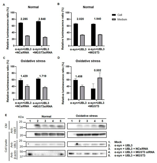 Overexpression of MGST3 increases α-syn secretion into the extracellular during oxidative stress. The siRNA, 3xFlag-UBL3, α-syn-HiBiT, and MGST3-HA were co-transfected into HEK293 cells. (A–D) show the relative luminescence ratios of α-syn-HiBiT detected in the cell and culture medium under MGST3 knockdown or overexpression and oxidative stress conditions. The values in (A) 2.285, 2.848, (B) 2.020, 1.940, (C) 1.429, 1.719, and (D) 1.458, 0.502 are the cell lysate-to-culture medium ratios of α-syn-HiBiT in each experimental group. All data are represented as mean ± SD. (n = 6 in the Normal group, n = 5 in the Oxidative stress group.) (E) Cell lysate and culture medium were blotted with various antibodies.