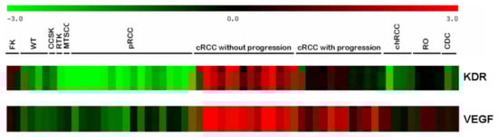 Expression of KDR and VEGF mRNA in distinct types of kidney tumors. KDR mRNA is expressed exclusively in cRCC without progression, whereas VEGF is expressed in nearly all conventional RCCs (marked in red). Abbreviations: FK, fetal kidney; WT, Wilms’ tumor; CCSK, clear cell sarcoma of the kidney; RTK, rhabdoid tumor of the kidney; MTSCC, mucinous tubular and spindle cell carcinoma; pRCC, papillary renal cell carcinoma; cRCC, conventional renal cell carcinoma; chRCC, chromophobe RCC; RO, renal oncocytoma; CDC, collecting duct carcinoma.