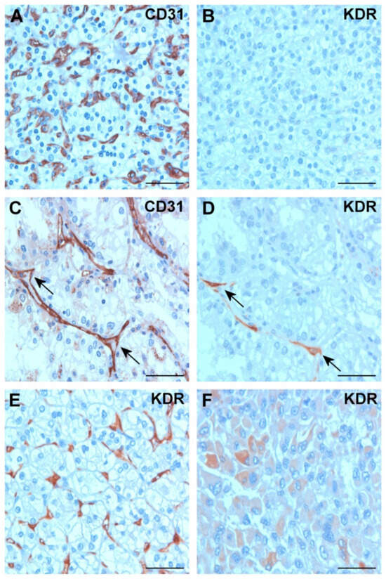 Expression of CD31 and KDR in conventional RCC. (A) Conventional RCC showing a capillary meshwork of CD31-positive endothelial cells. (B) No KDR expression is seen in identical TMA-biopsy specimen. (C) Strong CD31 expression in endothelial cells of a tubular–papillary growing conventional RCC (arrows). (D) In the same tumor biopsy, only few endothelial cells display positive staining with KDR antibody (arrows). (E) Diffuse regular meshwork of KDR-positive capillaries in a conventional RCC. (F) Positive KDR staining in the cytoplasm of a cRCC of rhabdoid histology. Scale bar: 40 μm.
