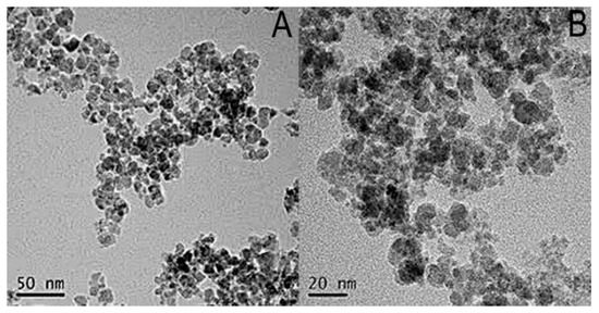 The morphology and size of MNPs@SiO2 and MNPs@HAase were characterized by TEM, as shown in Figure 1. Both the MNPs@SiO2 and MNPs@HAase exhibited fine dispersibility, and their diameters ranged from 5 to 15 and from 10 to 20 nm, respectively. We found that having the enzyme immobilized on the magnetic nanomaterial did not impact the dispersibility of the material. Furthermore, the change in size of the material demonstrated the successful fixation of the enzyme.