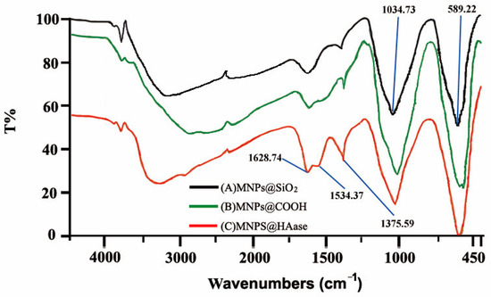 FT-IR spectra of MNPs@SiO2 (A), MNPs@COOH (B), and MNPs@Haase (C).
