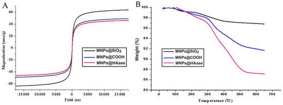 Magnetization curves (A) and TGA curves (B) of MNPs@SiO2, MNPs@COOH, and MNPs@HAase.