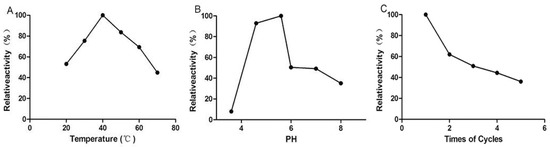 Effects of temperature (A) and pH (B) on the activity of MNPs@HAase and the reusability (C) of MNPs@HAase (the optimal activities for MNPs@HAase were taken as 100%).