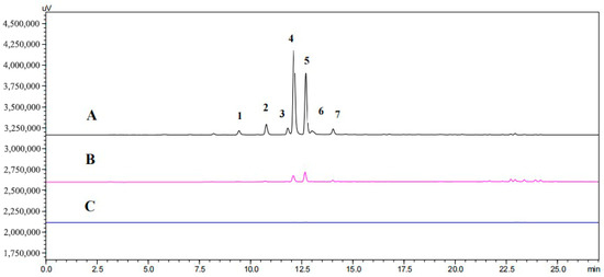 HPLC chromatogram of the ethyl acetate fraction of Salvia miltiorrhiza Bunge for S0 (A), S5 (B), and Blank S5 (C). (The numbers 1-7 in line A of the graph represent one peak, respectively.)