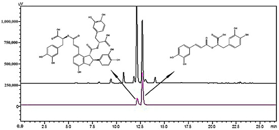 HPLC chromatogram of the ethyl acetate fraction of S. miltiorrhiza of S0 (black line), SAB, and RA (purple line). The chemical structure formulas of the two peaks of the purple line are shown by arrows.