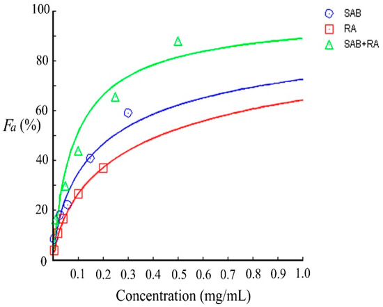 Dose-dependence of drug effect values Fa for SAB (blue line) and RA (red line) used alone and for the combination of SAB and RA (green line); the results represent five independent experiments.