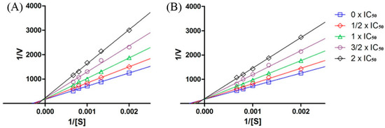 We conducted enzyme kinetic studies to explore the inhibitory patterns of the ligands of HAase, employing a method that was previously documented [40]. Based on the earlier HAase inhibition assay, 5 different concentrations of ligands (0, 1/2 × IC50, 1 × IC50, 3/2 × IC50, and 2 × IC50) were reacted with 5 different concentrations of sodium hyaluronate (500, 750, 1000, 1250, and 1500 µM). The reaction rate was monitored within the initial 30 min post-initiation. Grouping the samples by concentration, we derived the corresponding regression equations to construct the Lineweaver–Burk diagram, with the reciprocal of the average reaction rate (1/V) on the ordinate and the reciprocal of the substrate concentration (1/[S]) on the abscissa. From this diagram, we extracted the reciprocal of the transverse intercept (Km) and longitudinal intercept (Vmax) to compute the values of the constants Ki and Kis.