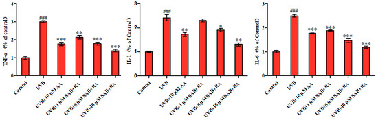 Effects of SAB/RA (3:2) on TNF-α, IL-6, and IL-1α levels in UVB-treated HaCaT cells. The cells were irradiated with UVB (200 mJ/cm2) and then treated with SAB/RA (3:2) at concentrations of 1, 5, and 10 μM, or AA at a concentration of 10 μM for 24 h. The values were presented as the mean ± SEM of triplicate experiments. ### p < 0.001 indicates a significant difference compared to the control group; *** p < 0.001, ** p < 0.01, and * p < 0.05 indicate significant differences compared to the UVB-treated group.