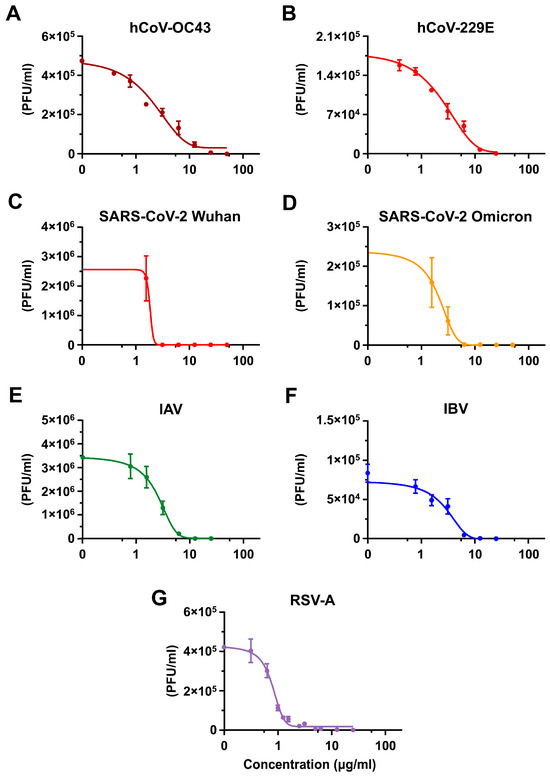 SP4™ inhibits the replication of hCoV-OC43, hCoV-229E, SARS-CoV-2, IAV, IBV, and RSV-A. (A,B) Focus forming reduction assays (FFRAs) were performed in HCT-8 and MRC5 cells infected with coronaviruses hCoV-OC43 (A) or hCoV-229E (B), respectively, and treated with different concentrations of SP4™ 1 h before, during, and post infection. At 72 h p.i., the viral foci were microscopically counted and converted into viral titer (plaque forming unit (PFU)/mL). (C–G) Virus yield reduction assays (VRAs) were performed in Calu-3 cells infected with SARS-CoV-2 Wuhan (C) or the Omicron BA.1 variant (D) and in A549 cells infected with influenza A (IAV) (E), influenza B (IBV) (F), or respiratory syncytial (RSV-A) viruses (G). Infected cell monolayers were treated throughout the experiment with different concentrations of SP4™. At 48 h p.i. for SARS-CoV-2 and IVs and at 72 h p.i. for RSV-A, cell supernatants were harvested and titrated by the plaque assay, as described in the Material and Methods. The data shown are the means ± standard deviations (SDs) (error bars) of n = 3 independent experiments performed in triplicate.