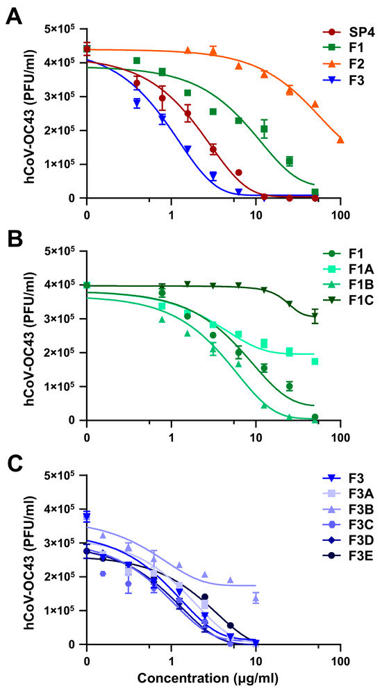 Anti-hCoV activity of the different fractions of SP4™. (A) FFRAs were performed in HCT-8 cells infected with hCoV-OC43 and exposed to different concentration of the primary fractions F1-F3. At 72 h p.i., the viral foci were microscopically counted and converted into viral titer (PFU/mL). (B,C) The secondary fractions obtained from the fractionation of F1 (F1A-C, (B)) or F3 (F3A-E, (C)) were analyzed by FFRAs in hCoV-OC43-infected HCT-8 cells treated with different concentrations of the samples. The results are shown as the means ± SD of n = 3 independent experiments performed in triplicate.