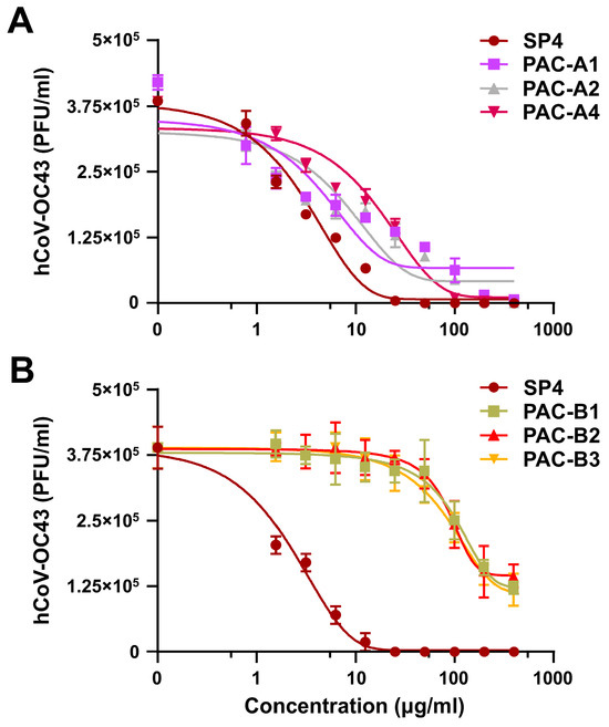 Synthetic dimeric PAC-As inhibit hCoV replication. (A,B) FFRAs were carried out in HCT-8 cells infected with hCoV-OC43 and treated with different concentrations of synthetic PAC-As (A) or PAC-Bs (B), present throughout the experiment. At 72 h p.i., the viral foci were microscopically counted and converted into viral titer (PFU/mL). The reported data are the means ± SDs of n = 3 independent experiments performed in triplicate.