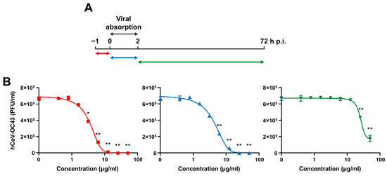 SP4™ acts during an early stage of the hCoV replicative cycle. (A) Schematic summary of the time-of-drug-addition experiment. HCT-8 cell monolayers were exposed to different concentrations of SP4™ 1 h prior to hCoV-OC43 infection (from −1 to 0 h; pre-treatment; red line), or during hCoV-OC43 infection (from 0 to 2 h p.i.; co-treatment; blue line), or after hCoV-OC43-infection (from 2 to 72 h p.i.; post-treatment; green line). (B) At 72 h p.i., hCoV-OC43 replication was assessed by FFRA, and the viral foci were microscopically counted and plotted as PFU/mL. The data shown are the means ± SD (error bars) of three independent experiments performed in triplicate and analyzed by a two-way ANOVA followed by Dunnett’s multiple comparison test. * p < 0.05; ** p < 0.01.