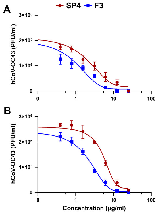 The effect of SP4™ and F3 on the entry phase of hCoV-OC43 was examined by infecting pre-chilled HCT-8 cells at 4 °C for 2 h. The infected cultures were then treated with different concentrations of SP4™ or F3 and shifted to 33 °C for 2 h to permit the entry of attached hCoV-OC43 particles. At the end of this time interval, hCoV viruses still bound to the cells were inactivated by treatment with acidic buffer, and the remaining hCoV-OC43 infectivity was evaluated at 72 h p.i. Figure 5B shows that both SP4™ and F3 were able to inhibit hCoV-OC43 cell entry in a concentration-dependent manner. Here, the measured EC50 values were 6.45 ± 0.14 μg/mL for SP4™ and 2.51 ± 0.04 μg/mL for F3. These results tell us that both SP4™ and F3 were more effective at interfering with cell attachment than with the subsequent entry phase of a prototype hCoV replication cycle.