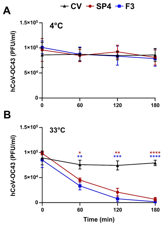 As shown in Figure 6A, the incubation of hCoV particles with either SP4™ or F3 at 4 °C for longer times did not bring about any further reduction in hCoV infectivity. Conversely, incubation at 33 °C abolished mostly the infectivity of hCoV-OC43 after 120 min of incubation, thus indicating that SP4™ and F3 were able to inactivate infectious hCoV (i.e., demonstrate virucidal activity) in time- and temperature-dependent manners (Figure 6B).