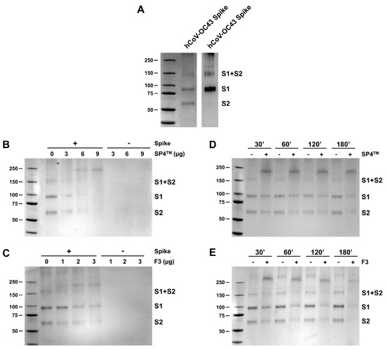 Subsequently, we incubated a purified recombinant SARS-CoV-2 (variant Omicron BA.1) S glycoprotein with increasing concentrations of either SP4™ or F3. The Omicron BA.1 S protein was expressed as a mutant in the furin cleavage site in HEK293 cells, so as to produce a trimeric structure detectable by SDS-PAGE as a single, monomeric S1 + S2 protein of about 160 kilodaltons (kDa) (Figure 8A). As previously observed for the hCoV-OC43 spike protein, exposing this SARS-CoV-2 S glycoprotein to either SP4™ (Figure 8B) or F3 (Figure 8C) led to a severe concentration-dependent decrease in the intensity of the S1 + S2 protein band and the appearance of other protein bands with less electrophoretic mobility. Moreover, the incubation of recombinant SARS-CoV-2 S with either SP4™ (Figure 8D) or F3 (Figure 8E) for different times once again produced a reduction in the S1 + S2 band and an alteration in its electrophoretic mobility toward forms with higher molecular weights (Figure 7D,E). These findings support the hypothesis that SP4™ and F3 interact with the spike protein of SARS-CoV-2.