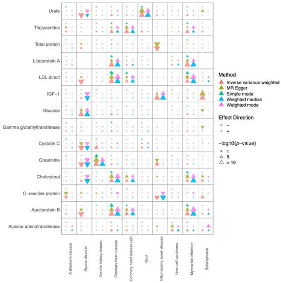 Although our study focused on links that were aligned with four or more MR methods, other notable relationships were identified that were aligned with 2–3 MR methods (Figure 1). For example, C-reactive protein (CRP) and Alzheimer’s disease were causally linked in two methods (MR-Egger and IVW), which has been previously noted in previous non-MR studies [].