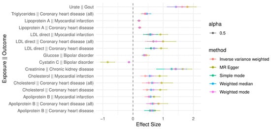 Several biomarkers are associated with an increased risk of disease. The average effect size of total cholesterol and coronary heart disease is 0.66, ranging from 0.90 ± 0.22 (MR-Egger) to 0.47 ± 0.13 (IVW). The association of total cholesterol and myocardial infarction has the average effect size of 0.61 with a range of (0.26, 1.13). For the apolipoprotein B and myocardial infarction, the average effect size is estimated as 0.59 with a range of (0.39, 0.90). For the glucose on bipolar disorder the average effect estimate is 0.39 with a range of (0.29, 0.55), while cystatin C has an inverse relationship on bipolar disorder with the average effect size of −0.31 ranging from −0.107 to −1 (Supplementary Table S1).