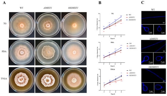Effect of DHXT1 on mycelial growth. (A) Growth of WT, ΔDHXT1 and OEDHXT1 transformants on PDA, TG and TYGA plates for 8 days. (B) Growth curves of WT, ΔDHXT1 and OEDHXT1 transformants on PDA, TG and TYGA plates for 8 days (ns p > 0.05, * p ≤ 0.05, ** p ≤ 0.01 and *** p ≤ 0.001). The growth rate of ΔDHXT1 mutants on PDA, TG and TYGA media was slightly slower than that of the WT, whereas the growth rate of the OEDHXT1 transformants was faster than that of the WT. (C) Mycelial and knob morphology of WT, ΔDHXT1 mutants and OEDHXT1 transformants on PDA plates for 6 days after calcofluor white (CFW) staining.
