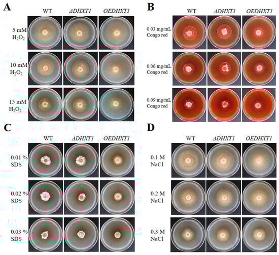 The WT, ΔDHXT1 mutants and OEDHXT1 transformants were maintained on TG plates containing a range of different stress conditions to evaluate their resistance. The results showed that neither the knockout nor overexpression of DHXT1 significantly altered tolerance to osmotic agents (NaCl), oxidizing agents (H2O2), and cell wall disruptors (Congo red and SDS). The results showed that there was no statistical difference in the growth of ΔDHXT1 mutants on TG plates containing different concentrations of NaCl, H2O2, Congo red, and SDS compared with the wild type (Figure 2A–D and Figure S4), except for 0.3 M of NaCl, on which the ΔDHXT1 mutants obviously grew faster than the WT (p ≤ 0.05). While the growth rate of the OEDHXT1 transformants was faster than that of the WT in different concentrations of 0.01% of SDS, 0.1 M of NaCl, 0.03 mg/mL of Congo red and 5, 10 and 15 mM of H2O2, it was not significantly different from the wild type under other conditions (Figure 2A–D and Figure S4). In addition, the results demonstrated that overexpression of the gene led to a reduction in aerial mycelia (Figure 2A–D).
