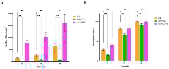 Effect of DHXT1 on trap formation and nematode mortality. (A) The number of knobs in WT, ΔDHXT1 mutants and OEDHXT1 transformants after 12, 24 and 48 h of nematode addition. (B) Nematode mortality of WT, ΔDHXT1 mutants and OEDHXT1 transformants after 12, 24 and 48 h of nematode addition. (ns p > 0.05, * p ≤ 0.05, ** p ≤ 0.01, and *** p ≤ 0.001).