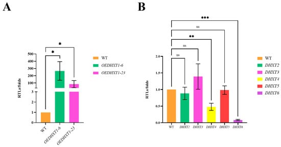 RT-qPCR analysis results. (A) Transcript levels of DHXT1 in the OEDHXT1-6 and OEDHXT1-23 transformants. (B) Transcript levels of other DHXT2-6 in the ΔDHXT1 mutants. (ns p > 0.05, * p ≤ 0.05, ** p ≤ 0.01, and *** p ≤ 0.001).