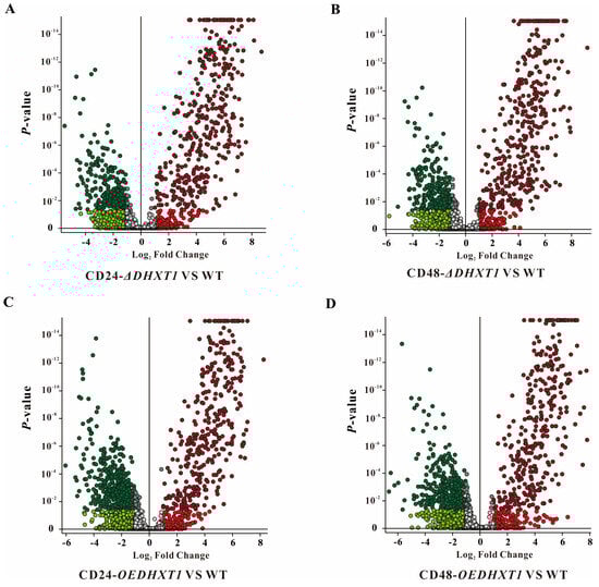 The RT-qPCR results showed that OEDHXT1-6 and OEDHXT1-23 were overexpressed by 265- and 82-fold (Figure 4A), respectively. In the ΔDHXT1 mutants, the knockout of DHXT1 resulted in a decrease in the transcript levels of DHXT4 and DHXT6, although there was no significant difference in the transcript levels of the other three CAP10-related genes (Figure 4B).