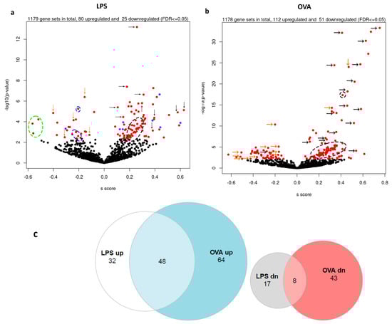 The difference between the responses to LPS and OVA challenges lies in the nature of the antigens, the type of immune responses they elicit and the pathways involved in regulating these responses. LPS primarily acts as a potent trigger for the rapid and non-specific innate immune response []. In contrast, OVA, a T-cell-dependent protein antigen, commonly engages more specific adaptive immunity pathways associated with antigen processing and presentation, as well as T-cell activation and differentiation, particularly Th2-type responses [,]. Our Mitch discordant analysis revealed four gene sets intimately associated with the adaptive immune system. These gene sets were notably upregulated in response to the OVA challenge, consistent with the expected adaptive immune response to a protein antigen. Among these, the gene sets related to immunoregulatory interactions between lymphoid and non-lymphoid cells and those involved in endosomal/vacuolar processes are particularly crucial in orchestrating antigen-specific immune responses []. This upregulation highlights the specific engagement and modulation of pathways crucial for the adaptive immune system in response to OVA, aligning with the known biology of how OVA challenges stimulate a complex and specific immune response.