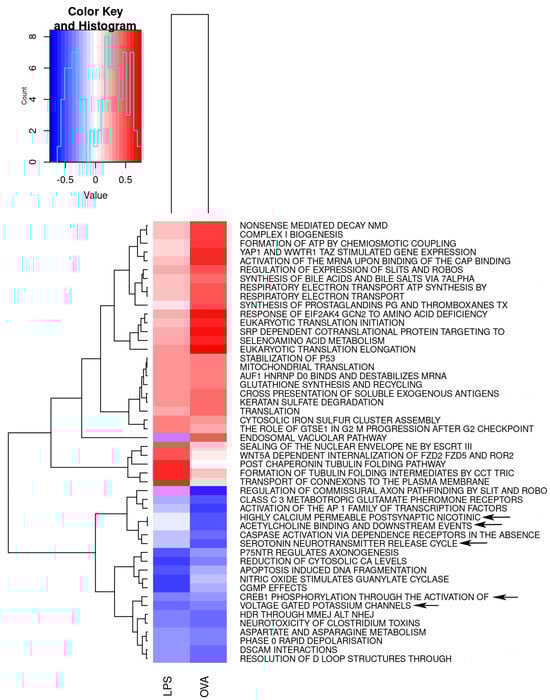 In order to gain a comprehensive understanding of the functions and impacts of the most significant gene sets, our approach involved multiple steps for analysis. Firstly, we used the RECTOME database to unveil the functional upstream hierarchy that governs these gene sets, subsequently categorizing them based on their shared traits. For instance, the prominent dysregulated gene sets exhibited functional links to diverse processes such as metabolic regulation, cellular response to stimuli, gene expression modulation, cell cycle progression and homeostasis maintenance. Interestingly, among the top 50 dysregulated gene sets, 5 were categorized under neuronal system signaling and were downregulated in both LPS- and OVA-challenged groups. These include highly calcium permeable postsynaptic nicotinic acetylcholine receptors, acetylcholine binding and downstream events, serotonin neurotransmitter release cycle, CREB1 phosphorylation through the activation of adenylate cyclase and voltage gated potassium channels. This highlights a specific brain immune response to asthma, indicating that asthma may not only be a respiratory condition but also one that involves complex neuro-immune interactions, as shown in Figure 3.