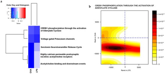 Integrated analysis identifies altered neuronal signaling gene sets in the hypothalamus in response to asthma challenge. (a) Heatmap for the five significant downregulated (blue) neuronal gene sets common to both LPS− and OVA−challenged groups. (b–f) Contour plots of these gene sets, where the X-axis represents gene rankings based on their fold change in the LPS group, and the Y-axis represents the rankings of the same genes based on their fold change in the OVA group, showing consistent downregulation of member genes in both asthma groups (dark red in all lower left quadrants). (b) CREB1 phosphorylation through the activation of adenylate cyclase, (c) voltage gated potassium channels, (d) serotonin neurotransmitter release cycle, (e) highly calcium permeable postsynaptic nicotinic acetylcholine receptors, (f) acetylcholine binding and downstream events.