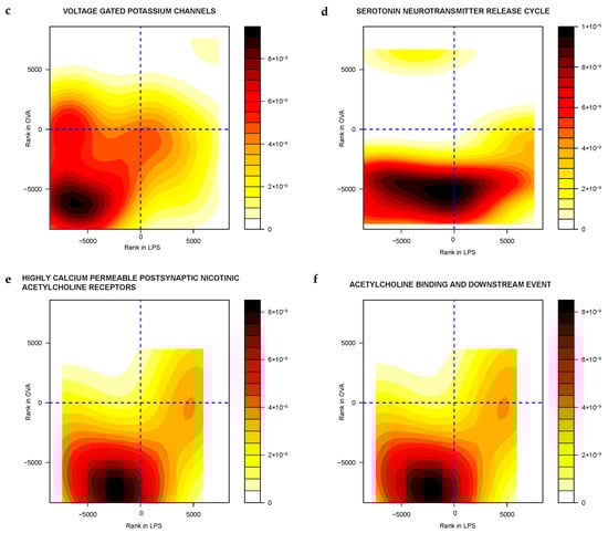 On top of that, nitric oxide stimulates guanylate cyclase, cyclic GMP effects, and reduction of cytosolic Ca (NO/sGC/cGMP) gene sets have been considered in memory formation. Usually, nitric oxide stimulates the soluble guanylate cyclase (sGC) and cyclic guanosine monophosphate (cGMP), which in turn, stimulate the long-term potentiation process (LTP), thereby enhancing memory formation processes in the hippocampus []. Interestingly, previous studies showed decreased NOS in the paraventricular nucleus of the hypothalamus of depressed patients [,]. Moreover, it is worth mentioning that the NO-sGC-CGMP pathway is the main driving force for cholinergic, glutaminergic and dopaminergic signaling []. Recently, some researchers explained the association between the neuroplasticity controlled by NO and its antidepressant effect []. Additionally, the NO signaling pathway was recently shown to regulate anxiety-related behavior in mice treated with lithium []. In line with this, these gene sets including the NO-sGC, reduction of cytosolic Ca and cGMP effects gene sets were also associated with mental health as previously reported in schizophrenia treatment [], anti-depressive effects [], pharmacological intervention for enhancing learning and memory formation and performance [,,,] and neuroprotective effects [].
