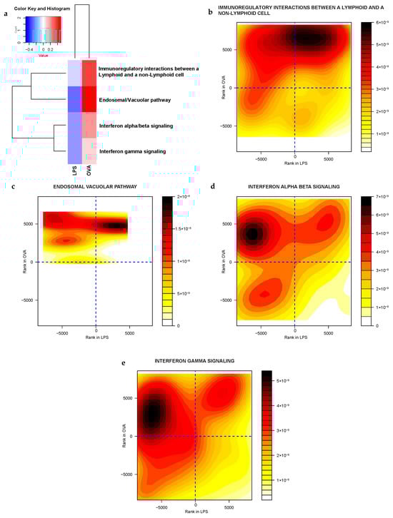 Integrated discordant analysis identifies differences in immune responses between LPS− and OVA−challenged groups in the hypothalamus. (a) Heatmap of the four adaptive immune signaling gene sets significantly downregulated (blue) in the LPS−challenged group and upregulated (red) in the OVA−challenged group. (b–e) Contour plots of these gene sets, where the X-axis represents gene rankings based on their fold change in the LPS group and the Y-axis represents the rankings of the same genes based on their fold change in the OVA group. A positive rank on the Y-axis coupled with a negative rank on the X-axis suggests an inverse relationship in the response of the immune system genes to LPS and OVA challenges. (b) Immunoregulatory interactions between a lymphoid and a non-lymphoid cell, (c) endosomal/vacuolar, (d) interferon alpha/beta signaling, (e) interferon gamma signaling.