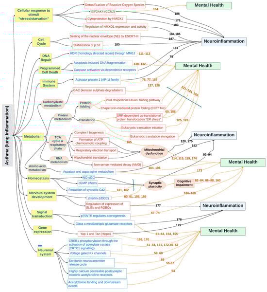 The prospective molecular basis of the lung−brain crosstalk within the hypothalamus underlying neuroinflammation and mental health problems. The top selected gene sets that were altered in the hypothalamus in response to asthma induction are depicted. Key elements of the upstream functional hierarchy are highlighted in yellow on the left. In the middle, gene sets that are upregulated are shown in red, and those that are downregulated are shown in blue. The right side depicts downstream effects associated with neuroinflammation (blue boxes) and mental health (green boxes). Of particular interest are five gene sets associated with neuronal signaling (**). Previous studies linking these gene sets to mental health or neuroinflammation are indicated by orange and black numbers, respectively. Detailed reference information is available in Supplementary Table S2.