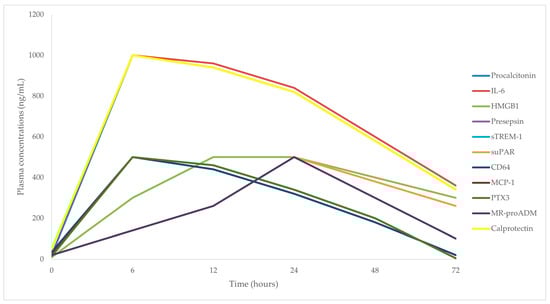 The changes in biomarker concentrations within the first 72 h of the onset of sepsis are illustrated in Figure 1. Procalcitonin exhibits a rapid increase, peaking sharply at around 6 h, followed by a gradual decline over the subsequent hours []. Similarly, IL-6 shows a swift rise, reaching its peak between 6 to 8 h []. The HMGB1 concentration increases more gradually, reaching a plateau at around 12 to 24 h and maintaining elevated levels before starting to decline towards the 72 h mark []. Presepsin levels rise quickly, peaking at approximately 6 h, and then decline gradually over the remaining period []. sTREM-1 follows a similar pattern, with a rapid rise peaking at around 6 h and a subsequent gradual decrease []. suPAR shows a steady increase, peaking at around 24 h, followed by a gradual decline over the next 48 h []. The CD64 concentration rises sharply, peaking at about 6 h, and then maintains higher levels before gradually decreasing []. MCP-1 levels peak at around 8 h, with a sharp initial rise followed by a steady decline over the remaining hours []. The PTX3 concentration exhibits a rapid increase, peaking at around 8 h, and then gradually declines over time []. MR-proADM shows a steady increase, peaking at around 24 h, followed by a gradual decrease towards the end of the observation period []. Finally, calprotectin demonstrates a rapid increase, peaking sharply at around 6 h, followed by a gradual decline []. Each biomarker follows a distinct pattern, highlighting the importance of monitoring multiple biomarkers to understand sepsis progression and severity.