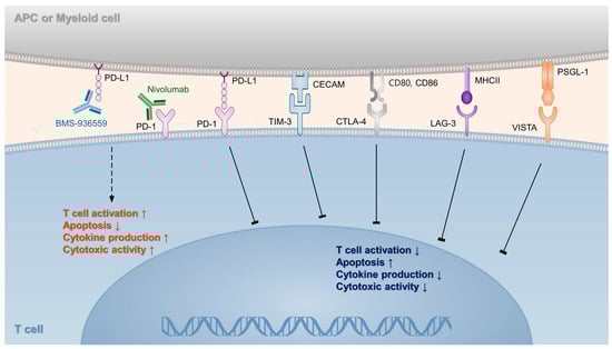 Immune checkpoints are numerous inhibitory pathways in the immune system that are crucial for maintaining self-tolerance and regulating immune responses []. Several immune checkpoints have been identified, including the cytotoxic T-lymphocyte-associated protein 4 (CTLA-4), T-cell immunoglobulin and mucin domain-containing protein 3 (TIM-3), lymphocyte activation gene 3 (LAG-3), and V-domain Ig suppressor of T-cell activation (Figure 2). The most well-known immune checkpoint in sepsis is the programmed cell death protein 1 (PD-1) pathway []. This system consists of the receptor PD-1 and its ligands, PD-L1 and PD-L2, which play a role in regulating the activation of T cells. In sepsis, the overexpression of PD-1 and its ligands, PD-L1 and PD-L2, is associated with decreased cytokine production, defective antigen presentation, impaired humoral immunity, and decreased phagocytosis [,,]. In a postmortem analysis of patients with sepsis, the expression of PD-1 in splenic T cells, PD-L1 in splenic capillary endothelial cells, and lung tissues was higher than that in the control group []. In a murine model of experimental sepsis, PD-1−/− mice exhibited decreased organ damage, lower cytokine levels, and a reduced bacterial burden. They are less vulnerable to cecal ligation and puncture-induced lethality than wild-type mice []. Furthermore, ex vivo studies on cells from patients with sepsis have revealed that inhibition of the PD-1/PD-L1 pathway reduces apoptosis, improves immune cell functions, and increases cytokine production [,]. The anti-PD-L1 monoclonal antibody was well tolerated in the first clinical trial of PD-1/PD-L1 pathway blockade in sepsis, and at higher dosages, it could restore the immunological state []. Other phase 1 clinical trials have shown that nivolumab, an anti-PD-1 antibody, is well tolerated in the treatment of patients with sepsis or septic shock. Additionally, nivolumab improves immune functions by increasing monocytic HLA-DR expression and absolute lymphocyte counts [,]. Strategies that modulate immune checkpoints in the treatment of sepsis seem to be promising, but caution is required because the blockade of PD-1/PD-L1 can trigger the immune system to attack healthy cells, resulting in various immune-related adverse events [].