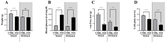 On Day 7 after STZ administration, the weight of male diabetic mice was lower than that of non-diabetic mice (CTRL; ^^^ p < 0.001), but this trend was not observed in female diabetic mice (Figure 1A). On Day 7, blood glucose levels were greater in diabetic mice than in non-diabetic male (^^^ p < 0.001) and female (^^^ p < 0.001) mice (Figure 1B). Both male and female diabetic mice displayed mechanical (male: ^^^ p < 0.001, female: ^^ p < 0.01; Figure 1C) and thermal (male/female: ^^^ p < 0.001; Figure 1D) hypersensitivity.