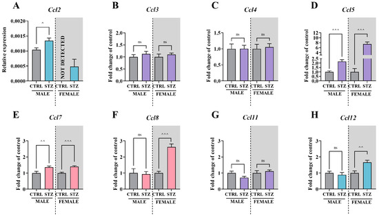 Changes in the mRNA levels of CCR2 and CCR5 ligands on the 7th day after vehicle or STZ treatment in male and female mice. The effects of a single STZ injection on the mRNA levels of Ccl2 (A), Ccl3 (B), Ccl4 (C), Ccl5 (D), Ccl7 (E), Ccl8 (F), Ccl11 (G), and Ccl12 (H) were measured by RT–qPCR. The data are presented as the fold change relative to that of control mice (non-diabetic mice injected with water for injection) ± SEM, except for (A), where data are presented as a relative expression ± SEM. The total number of animals was 43 mice, with 23 males (n = 10–12 per group) and 20 females (n = 8–11 per group), except for (D), in which females (n = 5–8 per group) were included. The results were statistically evaluated using a t-test; ^ p < 0.05, ^^ p < 0.01, and ^^^ p < 0.001 indicate changes compared with the control. Abbreviations: ns, not significant; STZ, streptozotocin; CTRL, control.