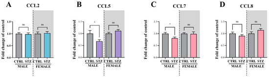 Changes in the protein levels of CCR2 and CCR5 ligands (CCL2, CCL5, CCL7, and CCL8) on the 7th day after vehicle or STZ treatment in male and female mice. The effects of a single STZ injection on the protein levels of CCL2 (A), CCL5 (B), CCL7 (C), and CCL8 (D) were measured by ELISA. The data are presented as the fold change relative to that of control mice (non-diabetic mice were injected with water for injection) ± SEM. The total number of animals was 40 mice: 20 males (n = 7–10 per group) and 20 females (n = 8–10 per group). The results were statistically evaluated using a t-test; ^ p < 0.05 indicates changes compared with the control. Abbreviations: ns, not significant; STZ, streptozotocin; CTRL, control.