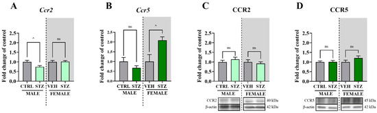 Changes in the CCR2 and CCR5 mRNA and protein levels on the 7th day after vehicle or STZ treatment in male and female mice. The effects of a single STZ injection on Ccr2 and Ccr5 mRNA (A,B) and CCR2 and CCR5 protein (C,D) levels were measured by RT-qPCR and Western blot, respectively. The data are presented as the fold change relative to that of control mice (non-diabetic mice were injected with water for injection) ± SEM. The total number of animals was 43 mice: 23 males (n = 9–12 per group) and 20 females (n = 7–11 per group). The results were statistically evaluated using a t-test; ^ p < 0.05 indicates changes compared with the control. Abbreviations: ns, not significant; STZ, streptozotocin; CTRL, control.