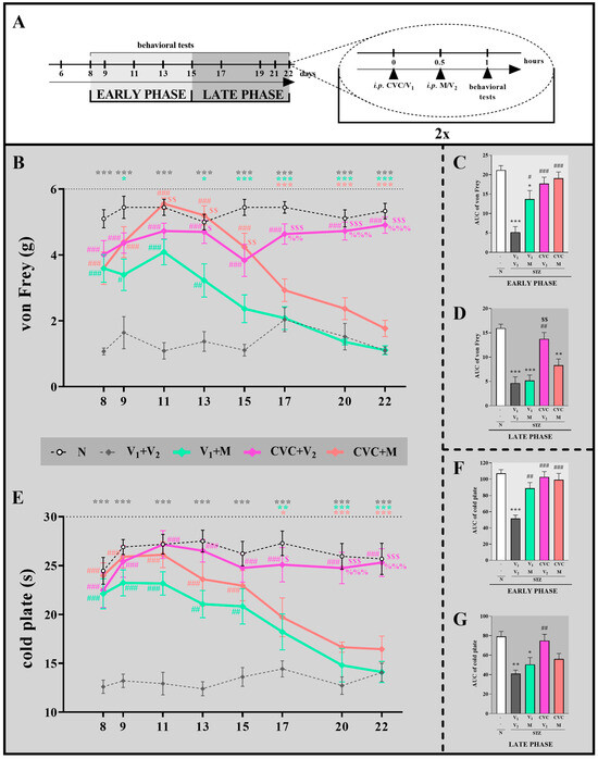 Effect of repeated i.p. CVC injections on pain hypersensitivity and morphine tolerance on Days 6–22 after STZ treatment in female mice. Pretests were performed on Day 6 after STZ injection. (A). Behavioral tests were performed on Days 8, 9, 11, 13, 15, 17, 20, and 22. In diabetic mice V2 or M was administered twice daily 0.5 h after V1 or CVC injection, and behavioral tests were performed 0.5 h after the last injection (A). Thermal and mechanical hypersensitivity were measured by von Frey (B) and cold plate (E) tests, respectively. The early (Days 8–15) and late (Days 15–22) phase AUC were calculated (C,D,F,G). The data are presented as the mean ± SEM. The total number of animals: 57 mice, n = 9–12 per group. The results were statistically evaluated using one-way ANOVA with the Bonferroni correction; * p < 0.05, ** p < 0.01, and *** p < 0.001 indicate changes compared with the naïve group; # p < 0.05, ## p < 0.01, and ### p < 0.001 indicate changes compared with the V1 + V2 group; $ p < 0.05, $$ p < 0.01, and $$$ p < 0.001 indicate changes compared with the V1 + M-group; and %% p < 0.01 and %%% p < 0.001 indicate changes compared with the CVC + M group. Abbreviations: AUC, area under the curve; CVC, cenicriviroc; intraperitoneal, i.p.; STZ, streptozotocin; V1, vehicle (1% DMSO); V2, vehicle (water for injection); M, morphine; N, naïve.