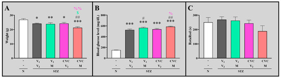 On Day 22 after STZ injection, a significant decrease in weight (Figure 7A) and increased blood glucose were observed (Figure 7B) in all studied groups of diabetic mice compared with the naïve mice. Moreover, on Day 21, no changes in motor functions were observed in the individual diabetic groups compared with the naïve group (Figure 7C). Compared with all the other groups, the CVC + M-treated group exhibited significantly decreased body weight and the highest blood glucose level. This was the only group in which we observed impaired motor functions, although this finding was not statistically significant.