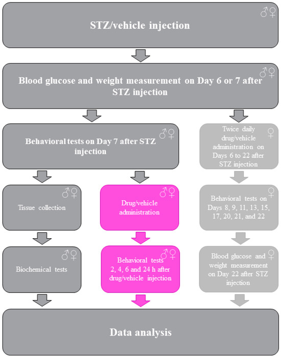 Streptozotocin (STZ; 200 mg/kg; Sigma-Aldrich, St. Louis, MO, USA) was suspended in water for injection and administered by a single intraperitoneal (i.p.) injection [27]. Age-matched non-diabetic mice were injected with water (CTRL). Glucose concentrations were evaluated on Day 5 or 6 after STZ injection using an Accu-Chek active glucometer (Warsaw, Poland). Cut-off value of the measurement was 600 mg/dL. Mice were considered diabetic when their serum glucose levels exceeded 300 mg/dL. Body weight measurements were performed on Day 6, and specific behavioral tests were always performed by the same experimenter on Day 6 or 7 after STZ administration.