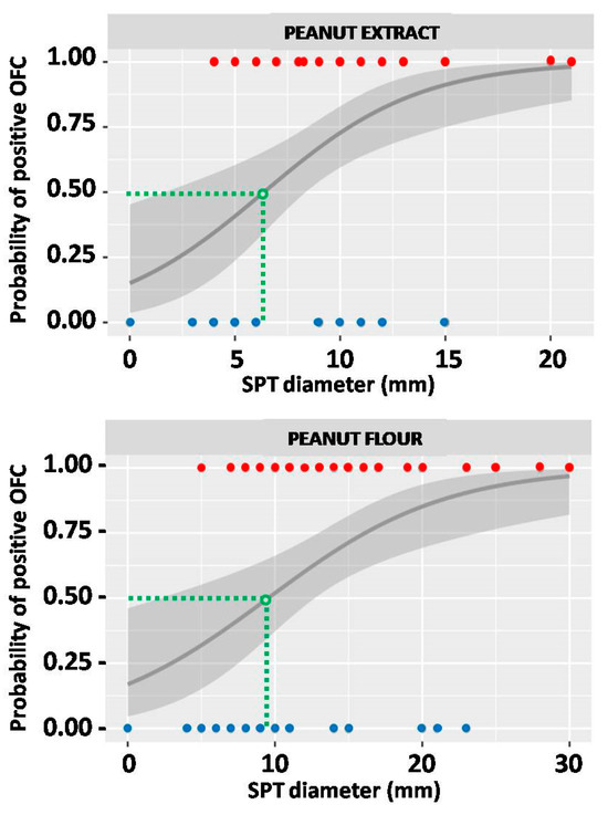 The probability of oral food challenge (OFC) outcome in relation to the result of skin prick test (SPT) with peanut extract (upper graph) and peanut flour (lower graph). Red dots represent SPT results of individuals from the OFC+ group, and blue dots those from the OFC− group. Green dashed lines indicate the SPT thresholds (expressed in millimeters), which correspond to 50% probability of positive OFC. The grey line represents probability curve, whereas grey shading corresponds to the 95% confidence intervals.