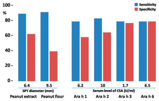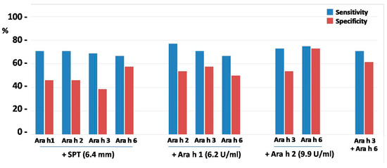 The calculation of sensitivity and specificity for the abovementioned CSA thresholds revealed that predictive values of CSA serum levels possessed slightly lower sensitivity (77.1–81.3%) when compared to SPT. However, in regard to specificity, it was similar (57.7–61.5%), or even better, especially for Ara h 3- and Ara h 6-specific antibodies (73.1% and 76.9%, respectively) (Figure 2).
