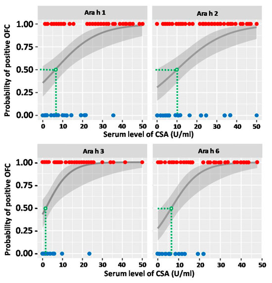 The probability of oral food challenge (OFC) outcome in relation to the serum level of respective component-specific antibody (CSA). Red dots represent CSA levels of individuals from the OFC+ group, and blue dots those from the OFC− group. Green dashed lines indicate the CSA thresholds (expressed in U/mL), which correspond to 50% probability of positive OFC. The grey line represents probability curve, whereas grey shading corresponds to the 95% confidence intervals.