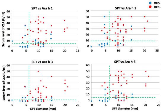 The comparison of threshold for skin prick test (SPT) in combination with those for various component-specific antibodies (CSAs). Red dots represent results of individuals from the OFC+ group, and blue dots those from the OFC− group. Horizontal green dashed lines indicate the respective CSA thresholds (expressed in U/mL), whereas the vertical lines indicate the SPT threshold (expressed in millimeters), both corresponding to 50% probability of positive oral food challenge.