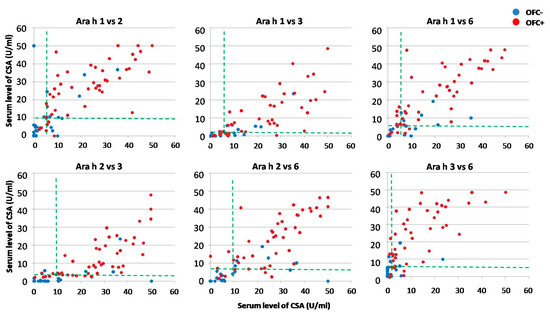 The comparison of thresholds for various combinations of component-specific antibodies (CSAs). Red dots represent results of individuals from the OFC+ group, and blue dots those from the OFC− group. Both horizontal and vertical green dashed lines indicate the respective CSA thresholds (expressed in U/mL), corresponding to 50% probability of positive oral food challenge.